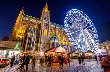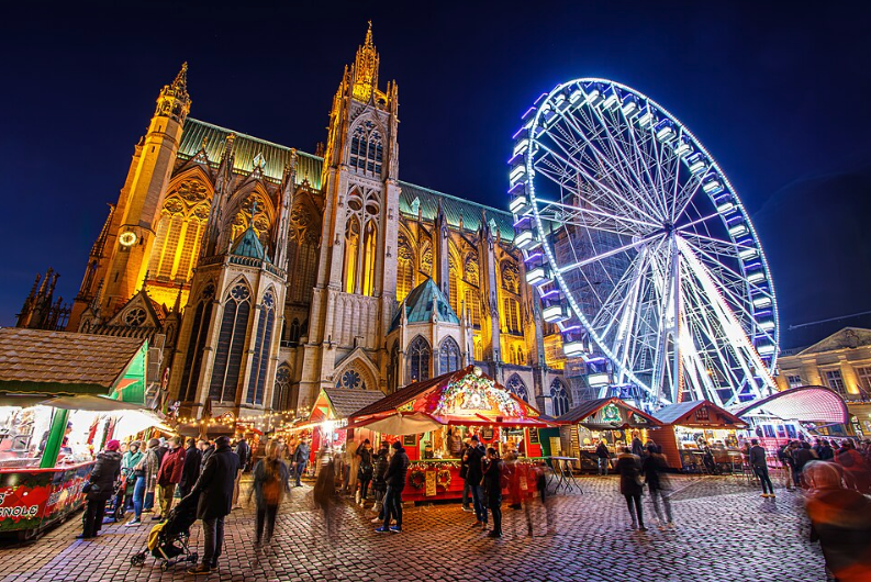 Metz propose aussi plusieurs attractions saisonnières, notamment une grande roue installée près de la cathédrale, qui offre une vue panoramique sur les toits, les marchés et les illuminations. Il peut aussi y avoir une tour panoramique (type City Skyliner) sur la place de la République, pour une vue encore plus haute sur la ville.